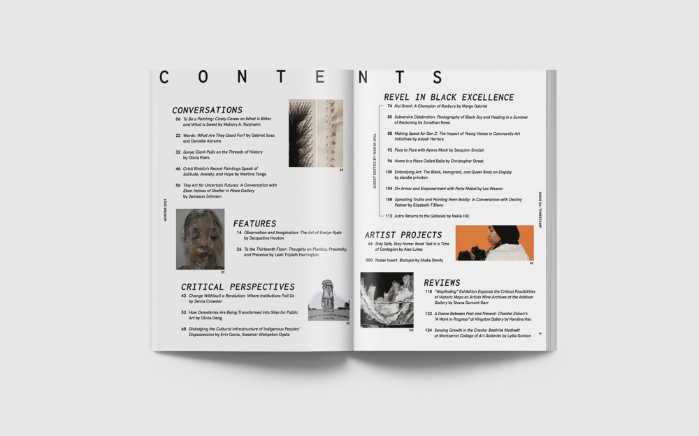 Nakia Hill generously joined as a guest editor and oversaw a section dedicated to reclaiming space and celebrating Black writers, artists, and creators based in Boston titled "Revel in Black Excellence." The section, which comprises nearly half the issue, is a space for joy, healing, journeys of self, remembrance, and visions of future through an African diasporic lens.